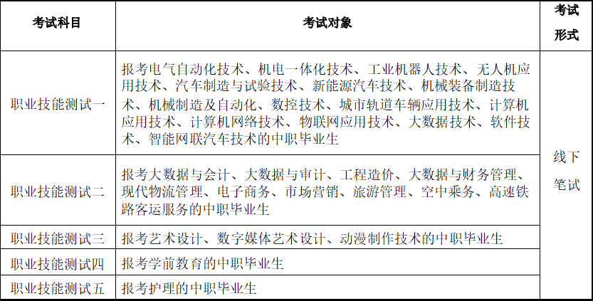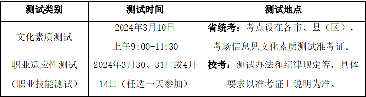 应往届普通高中毕业考生参加职业适应性测试,职业适应性测试主要考查考生未来从事 生产、建设、服务、管理等一线工作所必备的基本职业素质,主要采用开放性试题考查考生 的书面表达、逻辑思维、应试能力、知识面、专业特长等职业素质、职业潜能和能力倾向。总分300分,测试时间90分钟。